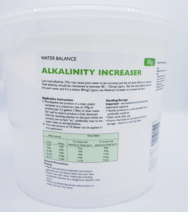 Application Instructions: Pre-dissolve the powder in a clean plastic container at a maximum rate of 100g of product per 10 litres (2.2 gallons) of clean water. Stir well to ensure that the powder is fully dissolved. Add the resulting solution to the pool whilst the pump(s) are turned ‘on’, preferably near to the water inlets to aid distribution. The total required amount of TA Raiser can be applied in one application unless metals are present in the pool water.