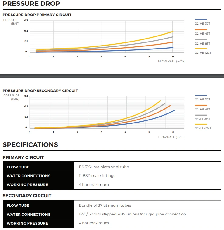 Elecro Multi-Tubular heat exchangers are comprised of a 37-piece Titanium tube bundle, giving a vast surface contact area for the two water circuits. The primary circuit chamber – through which water from the heating source travels – is very narrow, ensuring heat is absorbed and replaced with hot water quickly. These strategic design features enable the Elecro heat exchangers to perform very efficiently even when working with low value primary temperatures, such as solar heating systems. The rigid aluminium jacket encapsulating a pocket of air thermally insulates the entire unit, ensuring that heat is transferred within the desired chamber and absorbed by the swimming pool water, rather than lost to the atmosphere. Titanium Tube Bundles make the Elecro Heat Exchangers ideal for use on Salt Chlorinated pools.