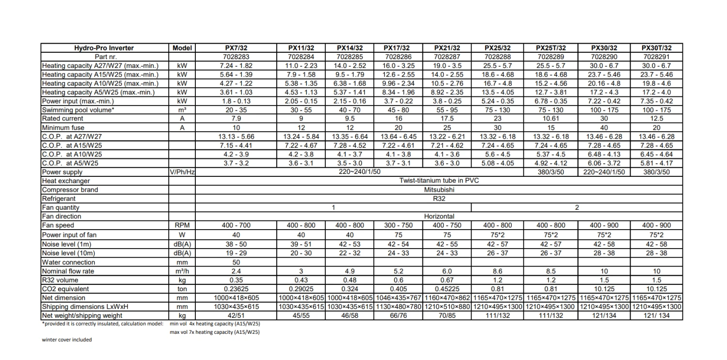 PX30T/R410A = Max Pool Volume for this model up to: 100 – 175m³ Dimensions: 1050/452/1295 mm