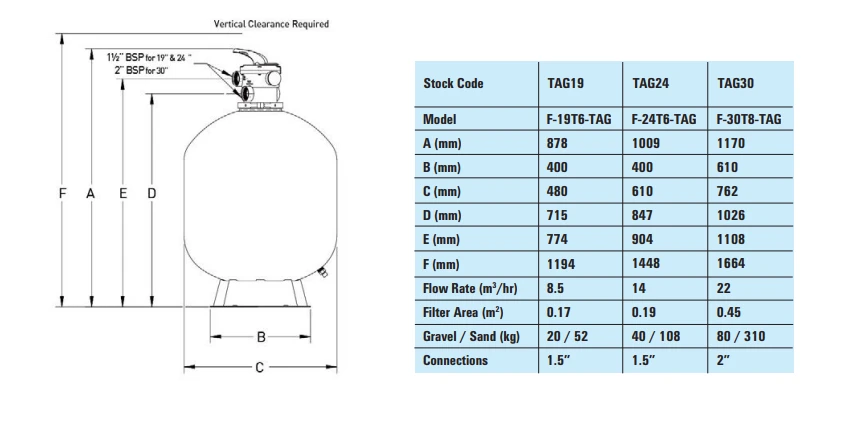 Tagelus Top Mount Sand Filter – TAG24 24” (610mm), 14m³/hr (C/W Tagelus Filter Tank, Multiport Valve & Pressure Gauge)